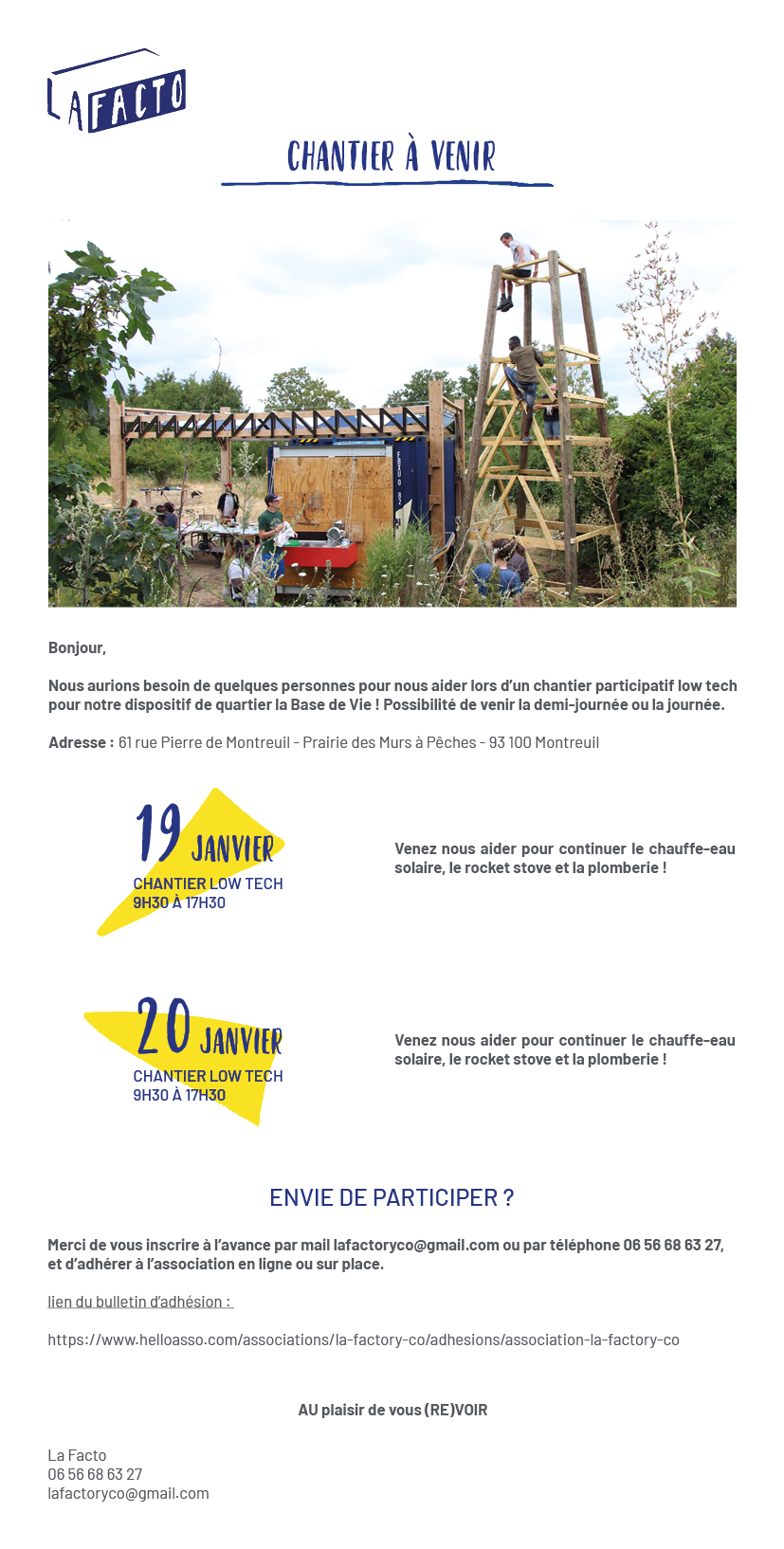 La Facto – Appel à bénévoles pour chantier participatif low tech – 19 et 20 janvier 19 janvier 2021 / map Toutes les infos iciappel-a-benevoles-chantiers-participatifs-19-et-20-janvierTélécharger Partager : Cliquez pour partager sur Telegram(ouvre dans une nouvelle fenêtre) Telegram Cliquer pour envoyer un lien par e-mail à un ami(ouvre dans une nouvelle fenêtre) E-mail Cliquer pour partager sur Mastodon(ouvre dans une nouvelle fenêtre) Mastodon Cliquer pour imprimer(ouvre dans une nouvelle fenêtre) Imprimer J’aime chargement… Articles similaires