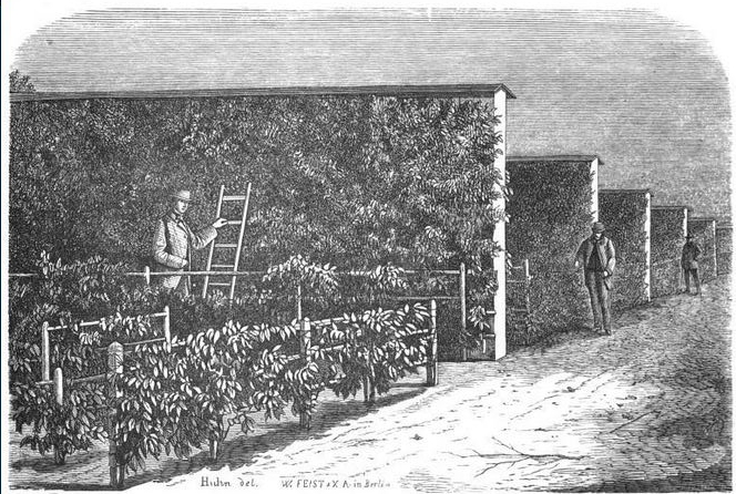 C’est en 1853, qu’Albert von Schlippenbach, grand propriétaire du Mecklenbourg et sa sœur, la Comtesse von Hahn, visitent Paris. Ils ont été extrêmement impressionnés par la qualité des fruits qu’ils ont goûtés et ils se sont renseignés sur la culture fruitière française. Ils ont ainsi visité les vergers d’Alexis Lepère l’Ancien, arboriculteur né en 1799 à Montreuil, primé en 1836 ar la Société royale d’horticulture de France et auteur de l’ouvrage « Pratique raisonnée de la taille des pêchers en espalier carré » paru en 1841.