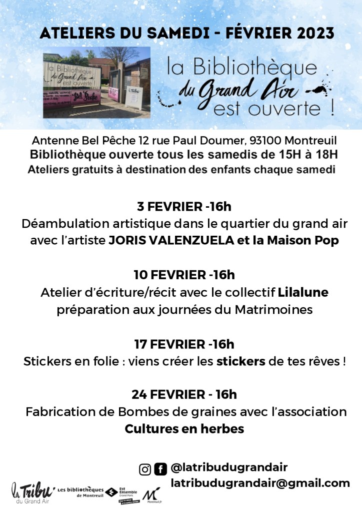 Veuillez trouver en pièce jointe la programmation du mois de février de notre bibliothèque du grand air. Les ateliers sont gratuits et à destination en priorité aux familles du REP+ Lenain de Tillemont.