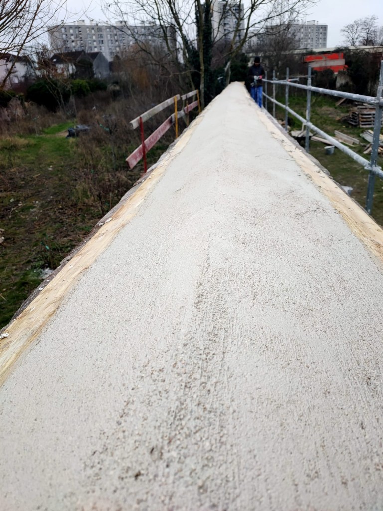 Des voliges ont été vissées de part et d’autre pour délimiter le coffrage du mortier chaux sable.