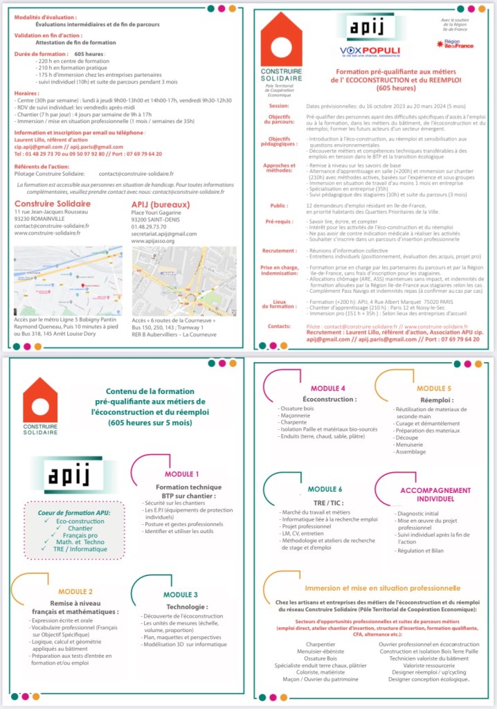 Un chantier d’apprentissage a eu lieu en février à Fruits Défendus, chantier intégré à la Formation pré-qualifiante aux métiers de l’ ECOCONSTRUCTION et du REEMPLOI, organisée par l’association Apij et la Scic Construire Solidaire.