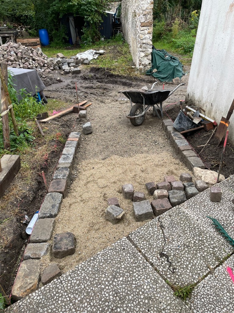 Réalisation d’une allée piétonne en pavés et d’une plateforme en bois