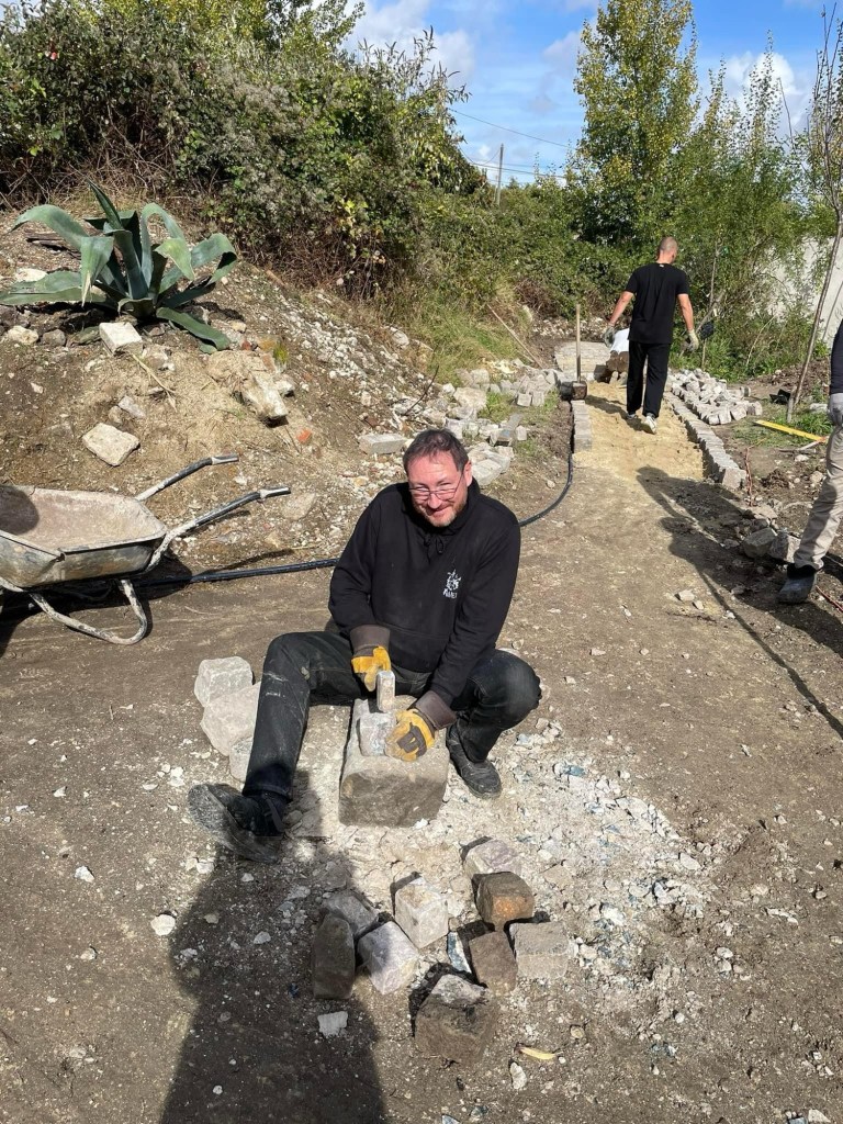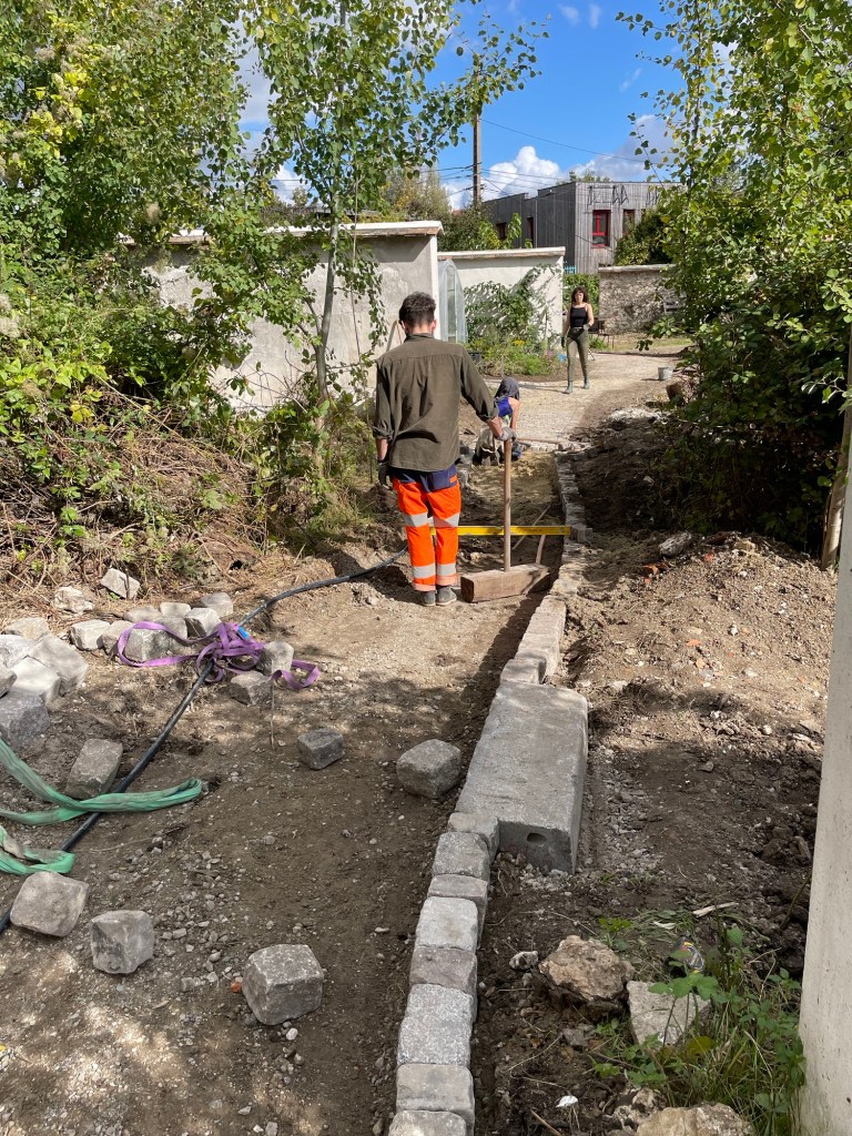 Les pavés ont pu être utilisés en l’état, sauf ceux qui étaient entourés de liant qu’il a fallu retirer au marteau: