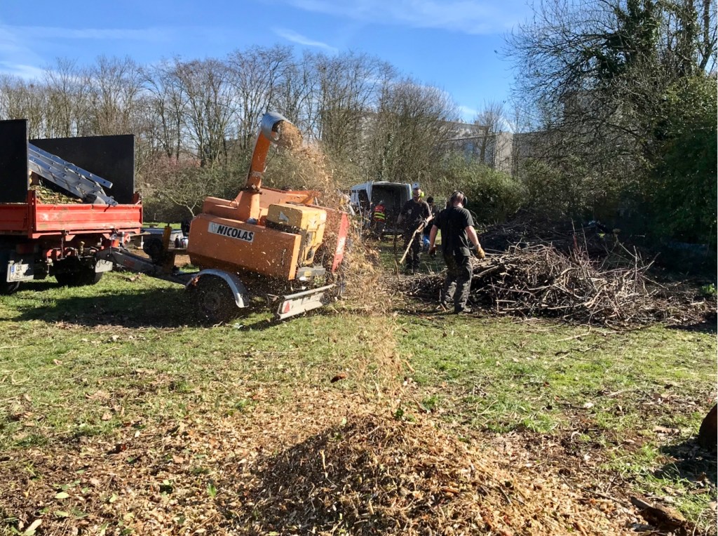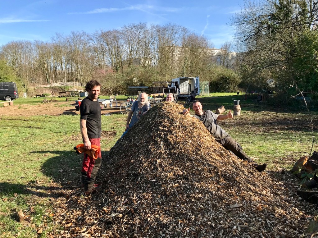 Malgré son aspect esthétique discutable, le but n’est pas de préserver ce tas de broyat, mais bien de le disperser sur les chemins de terre encore à nu d’ici la fête du printemps du 29 mars, avec, on l’espère, l’aide de l’association Emmaüs.