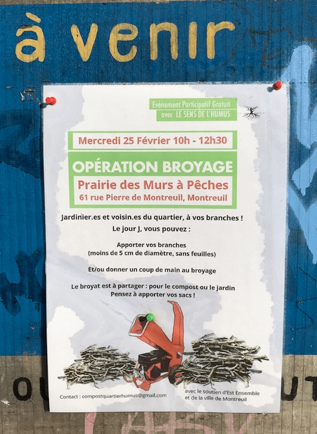 Ce mercredi 25 février, les Montreuillois ont été invités à participer à l’opération de broyage qui a eu lieu sur la prairie qui se prépare à accueillir les premiers festivals de la saison. Des adhérents, bénévoles du Sens de l’Humus, et des voisins venus de plus ou moins loin ont réussi à débarrasser des kilos de branchages en une matinée.