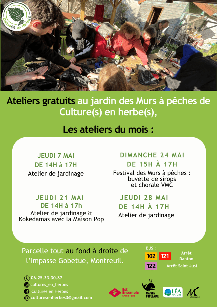 Les activités dans le jardin de Culture(s) en herbe(s) dans l’Impasse Gobetue vont continuer pour le mois de mai pour l’accueil des groupes dans leurs ateliers (gratuits et pour tous public). N’hésitez pas à les contacter pour en discuter. (par mail à culturesenherbes3@gmail.com ou par téléphone au 06.25.33.30.87)