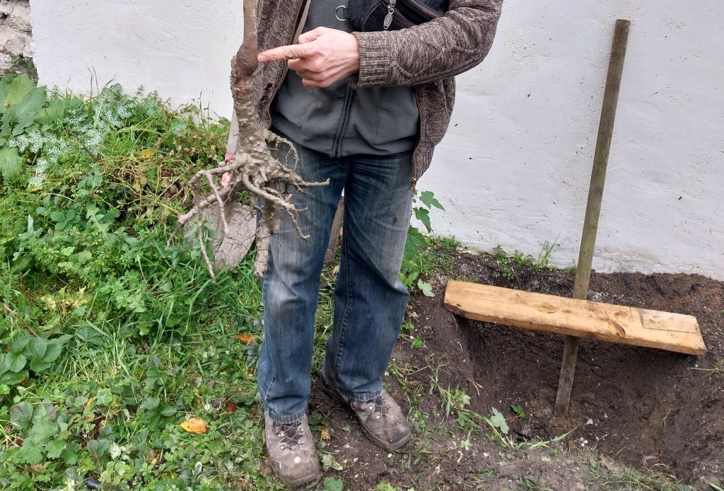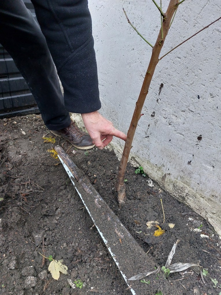 Il faut remblayer le trou jusqu’à être à la bonne profondeur et également vérifier l’espacement avec le mur : assez proche pour assurer le palissage à venir.