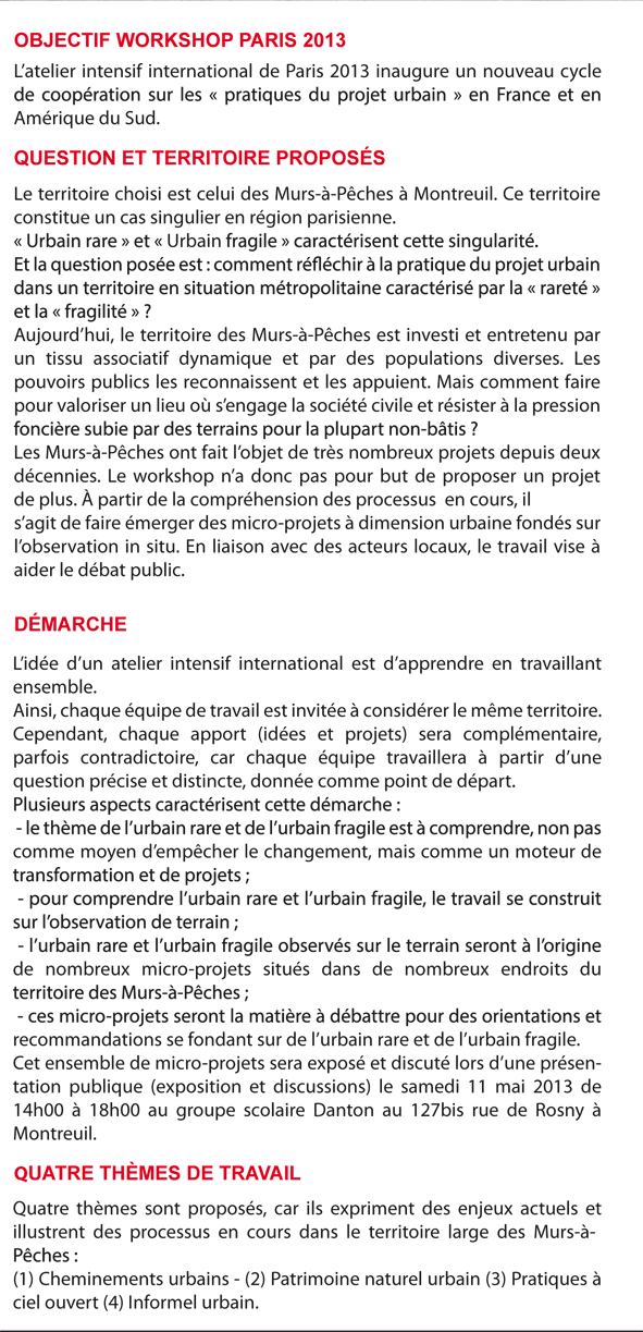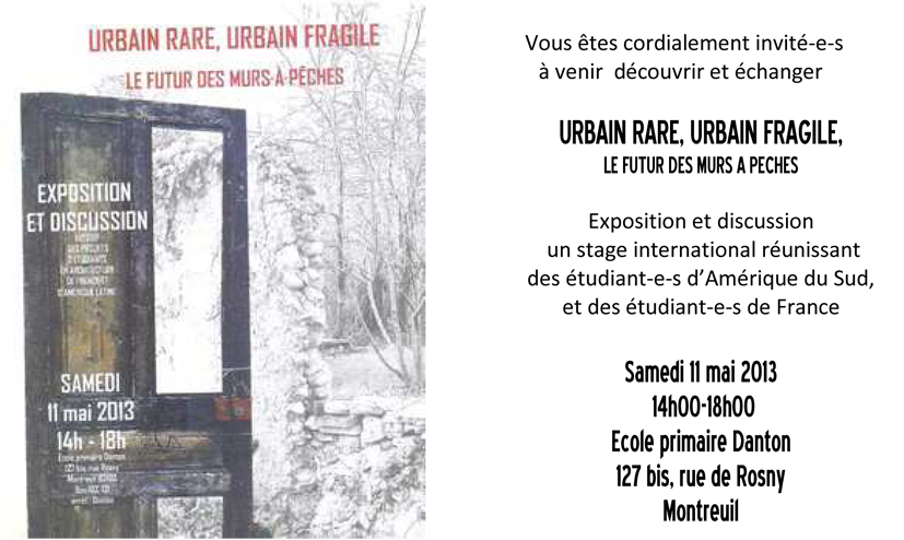 A ne pas manquer ce samedi: un atelier s’est déroulé sur les murs à pêches qui a regroupé étudiant-e-s de l’école d’architecture Paris la Villette et des étudiant-e-s hispanophones d’Amérique du sud pendant 10 jours. Ce samedi après midi 11 mai à l’école Danton, à Montreuil une exposition/restitution/échange sur l’ensemble de cet atelier. Pour plus d’informations vous pouvez consulter l’affiche et le mémento ci-dessous.