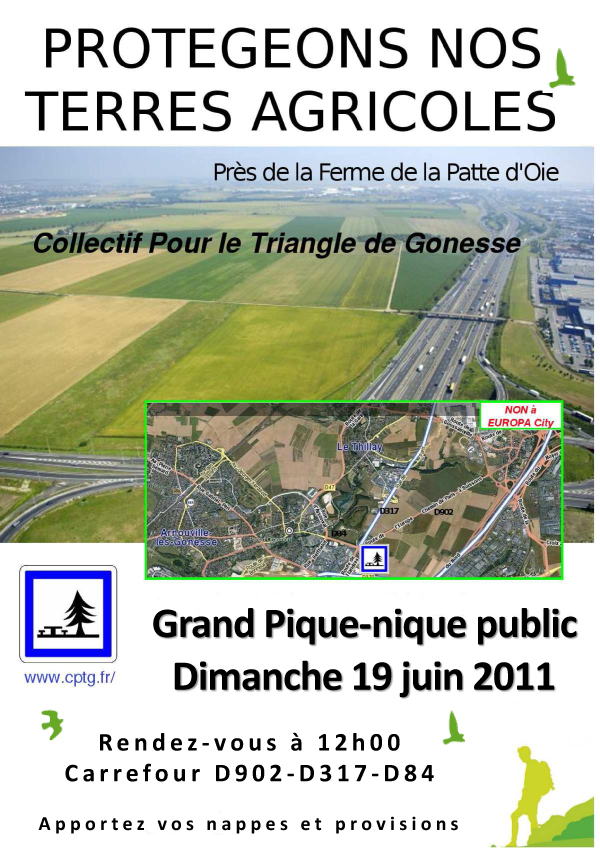 Situé sur le Triangle de Gonesse entre les deux aéroports de Roissy et du Bourget, Europa City est en fait un vaste supermarché avec des attractions et des loisirs payants (piste de ski et plage de sable fin).Europa City n’a pas sa place sur le Triangle de Gonesse : L’est du Val d’Oise et les communes voisines de Seine Saint Denis sont suréquipées en centres commerciaux. Contrairement à ce qui est dit ces équipements détruisent des emplois : pour un emploi créé dans la grande distribution, quatre emplois seront détruits dans d’autres secteurs de l’économie selon la chambre de commerce et d’industrie de Paris.